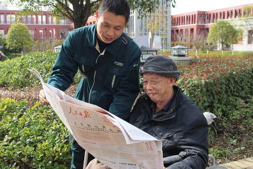 3月15日,湖北省十堰市邮政分公司三堰投递站投递员汪新海将当天的《人民日报》送到订户莫大爷手中,使其可以及时了解两会最新消息。