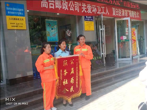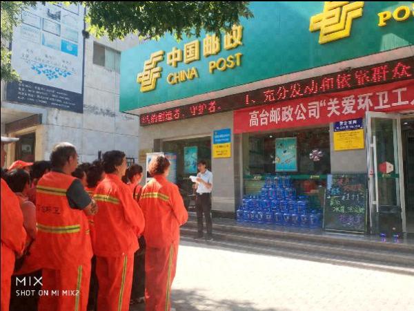 7月9日,高台县邮政公司为县环卫大队188名环卫工人开展了“关爱环卫工人、夏日送清凉”无偿捐赠公益活动,捐赠纯净水10000桶。