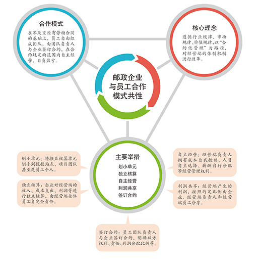 浙江义乌邮政的“准加盟”制、云南邮政的“创客计划”、山东邮政的“合伙人”制以及湖南邮政的“众创众享工程”,尽管模式千差万别,但原理大同小异,若从方法论的角度探究,离不开基于“合约”之上的资源配置,主要体现在:划小经营核算单元与所有权分配思想的建立;内部市场化与经营责任单元的利益分配;利益共同体的形成与体制机制改革的真正落地。