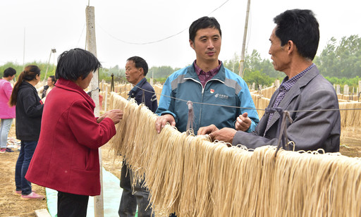 江苏省丰县邮政分公司王沟镇乡邮员赵本增热心帮助当地百姓脱贫致富。图为10月12日,赵本增途经粉条晾晒基地,主动提议用自己的“农民致富微信朋友圈”发信息帮经营业主卖粉条。 □卜庆海  刘立明  摄影报道