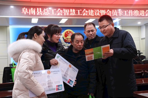 1月8日,邮储银行安徽省阜南县支行联合县总工会,举行了智慧工会建设暨会员卡工作推进会。该会员卡免费向全县工会会员发放,集工会帮扶服务、优惠购物消费、金融理财等多种功能于一体,持此卡可享受一元洗车、一元观影、超市满减、节日惠等优惠。截至目前,该会员卡已发放2000张。图为阜南县支行工作人员在推介会员卡。□刘华武  张晨曦  摄影报道