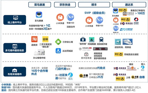单体企业间竞争走向平台体系间抗衡。阿里持续增强对通达系的掌控,自建丹鸟、增资菜鸟,收购网易考拉后清退京东、挤压顺丰;京东物流计划换掉平台上非自营商家的阿里系快递。预计下一步电商平台将通过多种手段引导客户选择快递供应商,电商快递间的竞争走向平台之争。