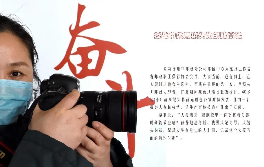 童莉,江苏省徐州市邮政分公司邮区中心局党务工作者。大疫当前,逆行而上,在关键时期她舍生忘死,奋战在第一线,用镜头为邮政人塑像,疫情期间有40多篇(条)新闻纪实作品先后在各级媒体发表,在抗疫情促生产宣传报道中作出了应有的贡献。