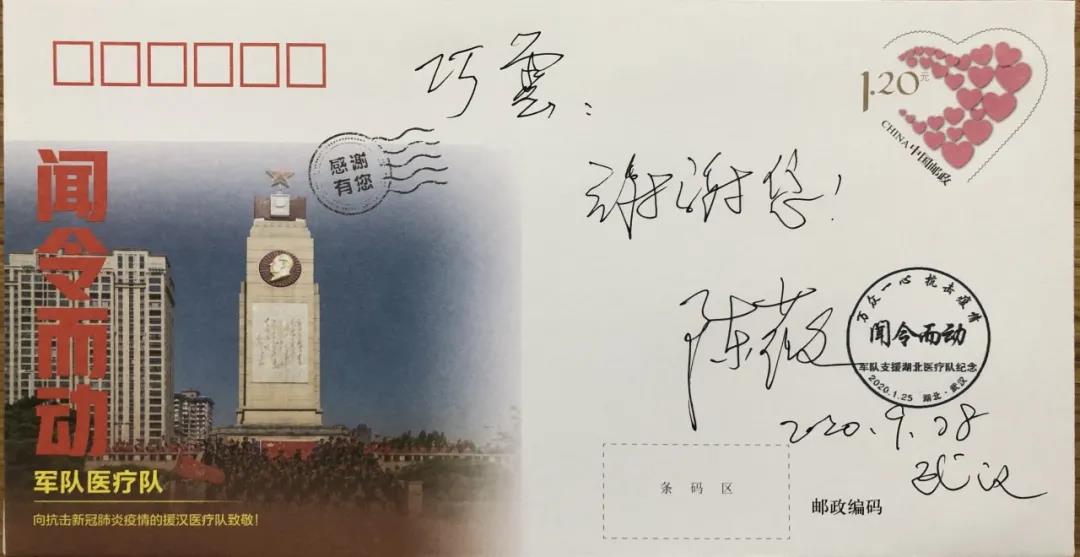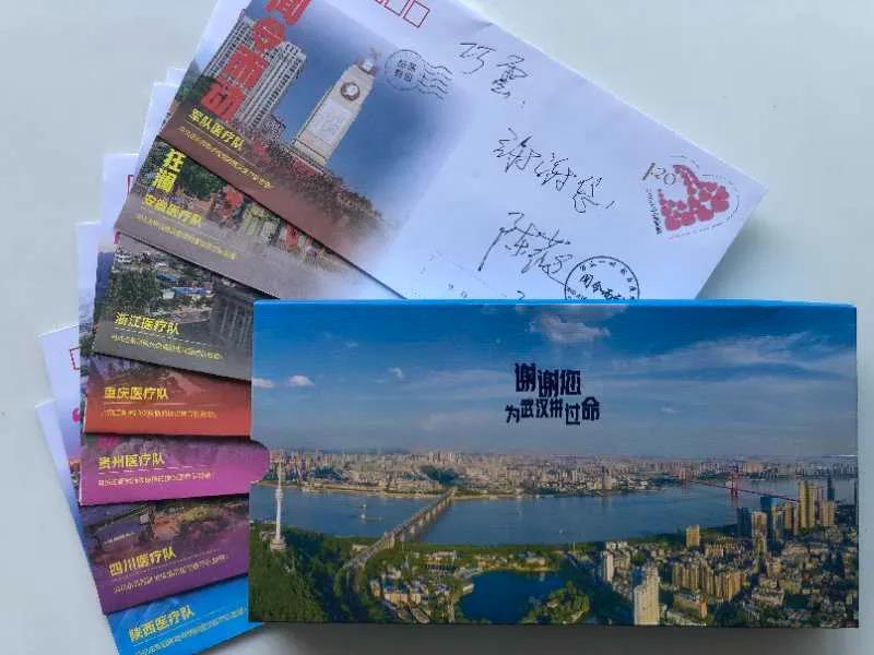 疫情期间,武汉市分公司为表达武汉人民对不计报酬、不论生死的援汉医疗队感恩、感谢、感激之情,以31支援汉医疗队为主题,融合武汉人文风光和特色地标元素,与人民日报社新媒体中心联合开发了这套《感恩有你》抗疫纪念邮资封。用邮政特有的“文化符号”致敬仁心、感恩大爱,铭记为武汉拼过命的人们。9月24日,在挑选送给108位勇士的礼物时,从军29载的陈薇院士经过反复斟酌和比较,在武汉市分公司推荐的多款抗疫邮品中,最后敲定了这套含有军队医疗队纪念封的邮品。
