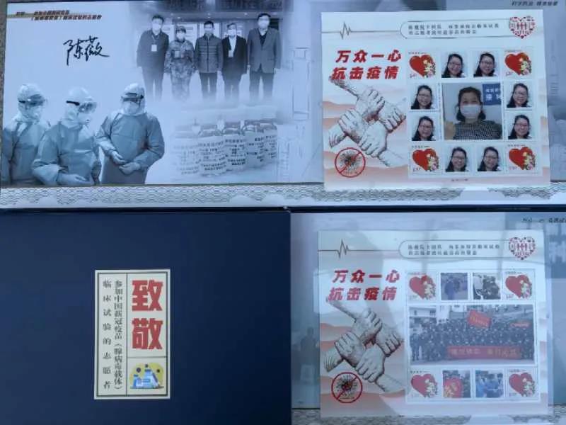在陈薇院士和团队成员张振威主任、邵龙飞教授以及邮政工作人员的共同努力下,武汉市分公司先后为参加重组新冠疫苗I期、Ⅱ期临床试验的志愿者设计制作了2000套纪念品,均在第一时间送往陈薇团队驻地,让这份心意能最快地到达志愿者手中,传递到他们心里。