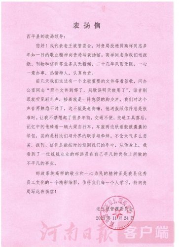 这位被表扬的投递员名叫高祥,是西平县邮政分公司揽投部的一名投递员,在投递岗位上勤勤恳恳的工作了31年,也是资历最老的投递员了。他每日从揽投部要跑40多分钟才能到达投递段道,服务区域主要集中在老王坡农场等,投递里程超57公里。