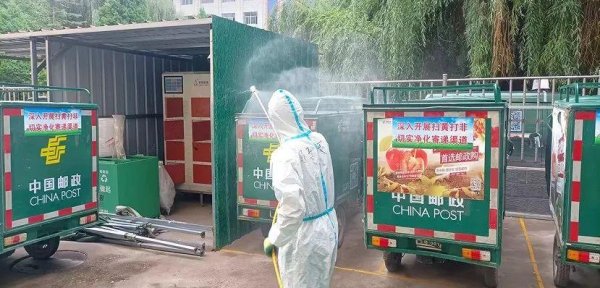 “您好,中国邮政快递,您的快递到了,麻烦您来小区门口取一下,我在小区门口等您。”打完电话后,米永前戴着橡胶手套取出随身携带的酒精小喷壶,将派送的包裹进行了简易消杀,随即将包裹放置在快递车顶等待顾客自取,这样就避免了与客户直接接触。