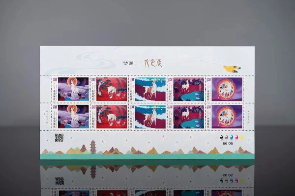 《动画-九色鹿》特种邮票延续动画系列邮票的设计形式,画面采用了敦煌壁画的设色风格,同时呈现出动画原片中高丽纸勾线渲染的工笔重彩特点。在《动画-九色鹿》特种邮票中,第一图表现了九色鹿在荒无人烟的戈壁滩,为迷路的波斯商人指点方向;第二图表现了九色鹿善待万物,总是救助陷入绝境的动物,创造了一个无忧无虑、花繁叶茂的动物天堂;第三图表现了采药的弄蛇人不慎落水,被九色鹿驮上岸边从而得救;第四图表现了弄蛇人见利忘义,向国王告密,并假装再次落水,将九色鹿引入包围圈;第五图表现了九色鹿发出神光,将众士兵射出的利箭化为灰烬。