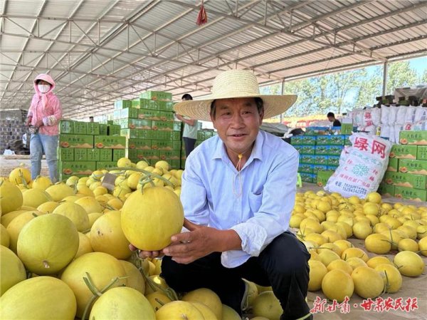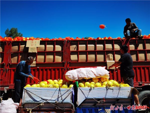 在民勤蜜瓜核心产区收成镇瓜果市场,车水马龙、热闹非凡,空气中弥漫着蜜瓜的清香味。满载蜜瓜的农用车、快递车游走在商户之间,工人们将刚收购的蜜瓜迅速分拣,套袋、装箱、封口、贴条形码、装车,分工明确,一气呵成。