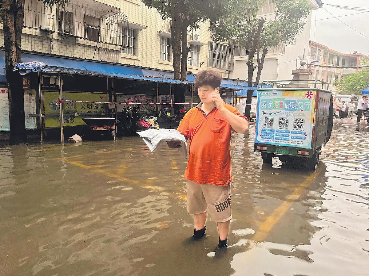 南宁市邮政分公司投递员蹚着积水坚持投递。