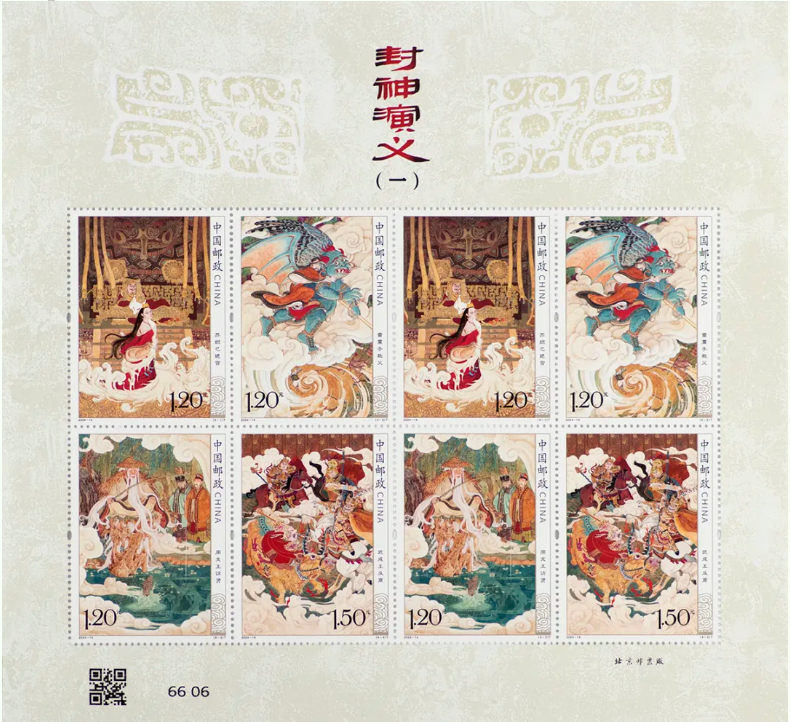 中国邮政定于2024年7月13日发行《封神演义(一)》特种邮票1套4枚、小型张1枚,邮票图案名称为苏妲己进宫、雷震子救父、周文王访贤、武成王反商,小型张图案名称为哪吒闹东海。全套邮票面值11.10元。邮票计划发行数量为套票686.45万套、版式二83.15万版、小型张530.2万枚。