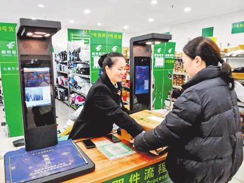 上午9点45分,李如琴在民心佳园邮快超市收取前一天下午订购的龙安柚邮件。