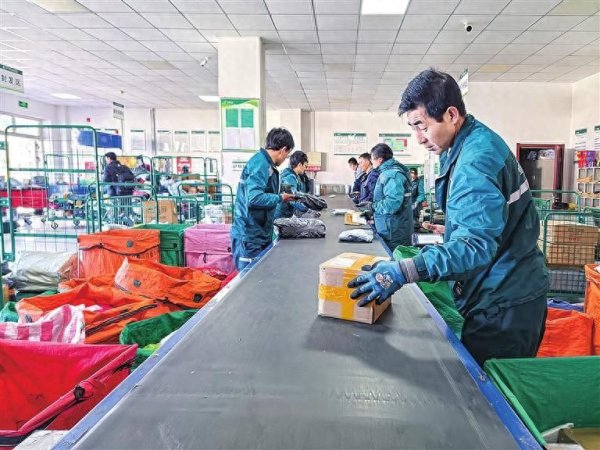 民勤县邮政寄递物流共配中心工作人员在分拣、扫码邮件。